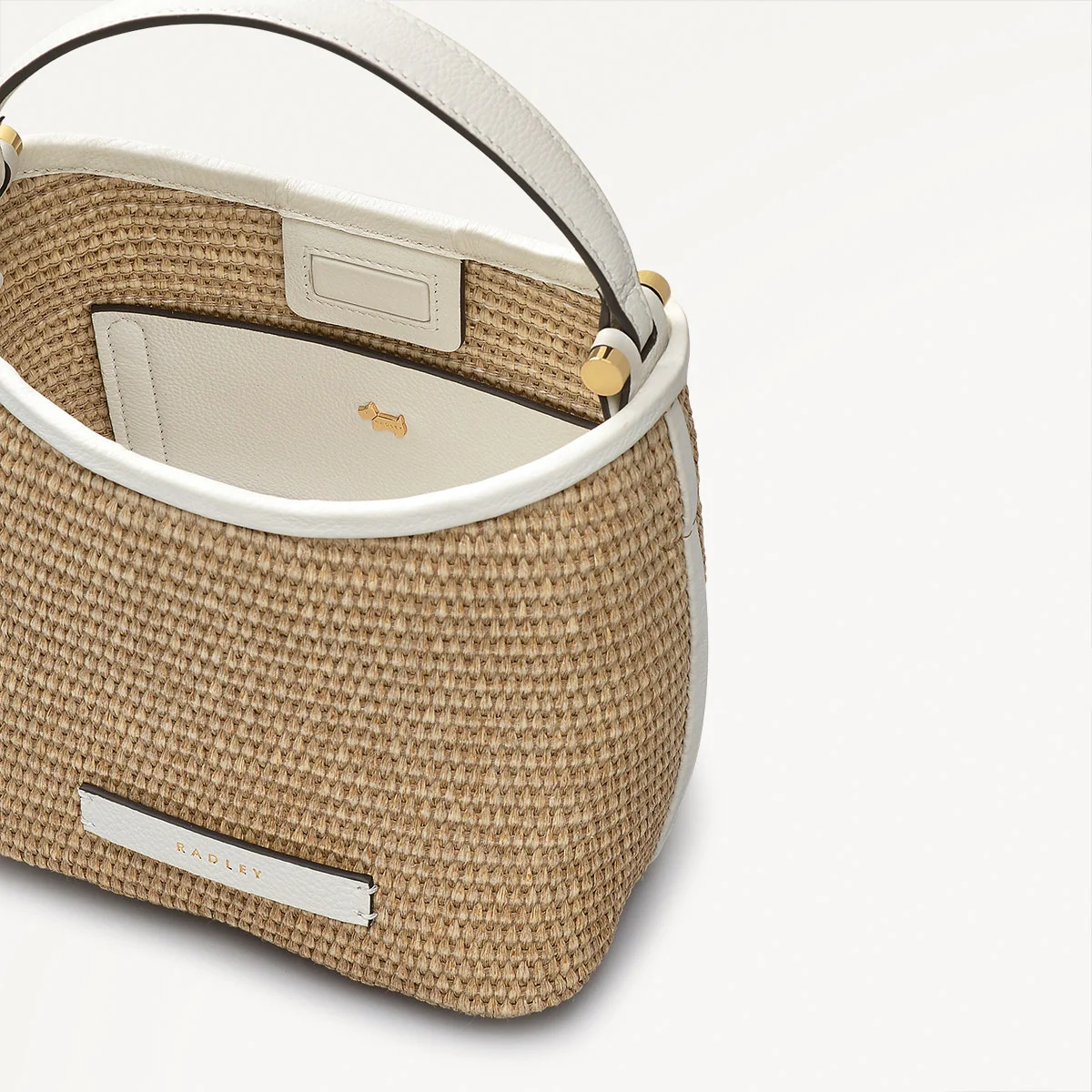 Functionality, style and textured materials, this edition of our Bathurst Mews Satchel bag has it all. Crafted with woven raffia and contrast leather trims, this summery bucket shape can be carried in hand, or by your side with the long detachable strap.
